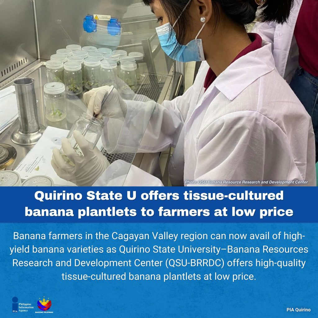 DIFFUN, Quirino (PIA) โ โ Banana farmers in the Cagayan Valley region can now avail of high-yield banana varieties as Quirino State UniversityโBanana Resources Research and Development Center (QSU-BRRDC) offers high-quality tissue-cultured banana plantlets at low price.