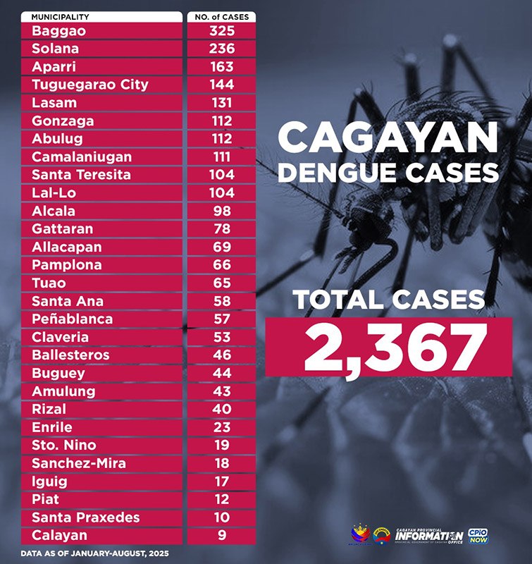 Batay sa datos ng PHO, ang bayan ng Baggao ang may pinakamaraming kaso na umabot sa 325, sinundan ng Solana na may 236, at Aparri na may 163. Sa Tuguegarao City, bahagyang tumaas ang kaso sa 144, nguni’t nananatiling kontrolado ayon sa PHO dahil sa pagpapatupad ng mga kaukulang hakbang.