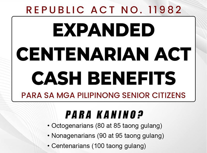 Under the Expanded Centenarian Act, senior citizens who reached the milestone ages of 80, 85, 90 and 95 will be entitled to receive cash incentives of PhP10,000 while those who reached the age of 100 will be getting P100,000 from the government.