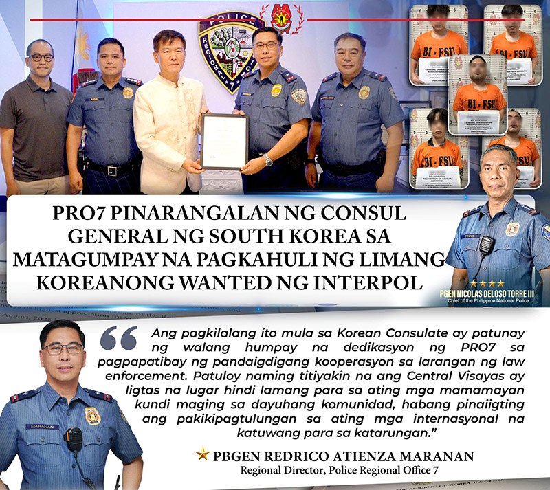 CEBU, Philippines — Personal na bumisita si Consul General Song, Sewon ng Korean Consulate sa Cebu upang ipagkaloob ang Letter of Appreciation kay Police Brigadier General Redrico A. Maranan, kasunod ng matagumpay na pagsisilbi ng Interpol Red Notices sa mga Korean na pinaghahanap ng interpol, noong Agosto 18, 2025.
