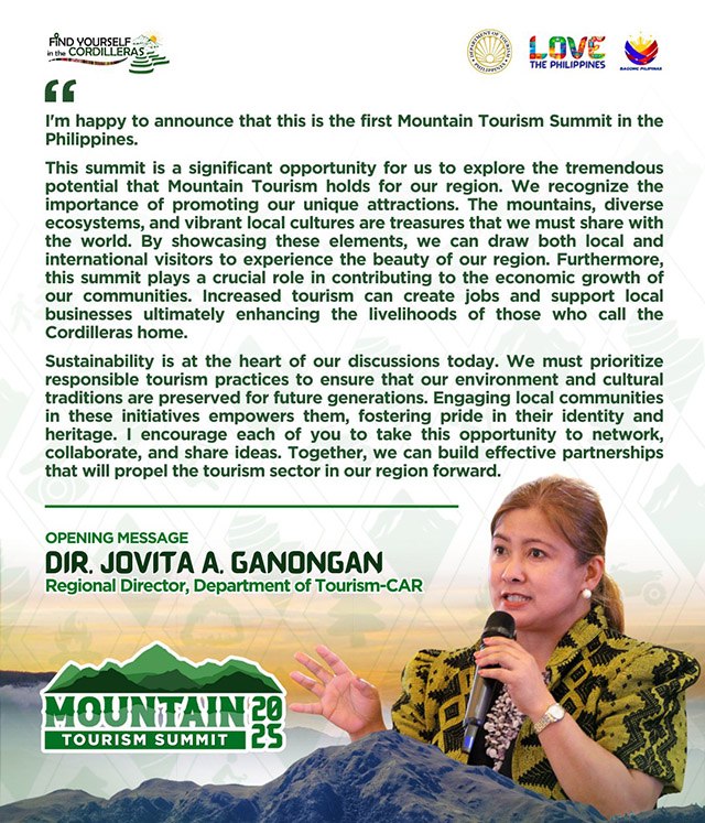 At the Mountain Tourism Summit 2025, DOT–CAR Regional Director Jovita Ganongan marked a historic milestone for the country, sharing that “this is the first Mountain Tourism Summit in the Philippines.