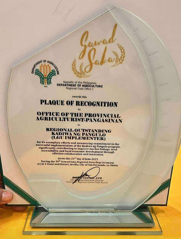Region 1LINGAYEN, Pangasinan – Kinilala ng Department of Agriculture ang pagsisikap ng tanggapang panlalawigan sa pagsuporta sa mga lokal na magsasaka nang igawad nito ang ‘Gawad Saka Award’ sa Office of the Provincial Agriculturist bilang Region 1’s Outstanding Kadiwa ng Pangulo LGU Implementer. Sina Provincial Agriculturist Dalisay Moya at Provincial Legal Officer Baby Ruth Torre ang tumanggap ng parangal sa ngalan ni Governor Ramon V. Guico III sa ika-50 Gawad Saka Parangal ng mga Natatanging Magsasaka sa Mangingisda, noong Hunyo 23, sa San Fernando City, La Union,. Nangako si Gob. Guico na paigtingin ang mga programang nakabatay sa agrikultura na magpapalakas sa produksyon ng agrikultura na tutulong sa mga magsasaka na mapataas ang kanilang ani at kakayahang maibenta. Inilunsad noong 2022, ang gobernador ay nag-utos para sa mas pinaigting na promosyon ng programa na sa Enero 2024, ang proyekto ay pinangalanang ‘Kadiwa na Kapitolyo’ at gaganapin dalawang beses sa isang buwan sa Capitol Complex grounds. Ang Kadiwa ay isa sa mga programang agri-based ng pambansang pamahalaan, na aktibong isinusulong ng kasalukuyang administrasyon. Ang Kadiwa On-Wheels na Kapitolyo, sa kabilang banda, ay isang collaborative project ng provincial government kasama ang DA kasama ang iba’t ibang ahensya tulad ng Department of Trade and Industry (DTI), Department of the Interior and Local Government (DILG), Department of Labor and Employment (DOLE), Department of Social Welfare and Development (DSWD), Bureau of Fisheries and Aquatic Resources (BFARNFA), Bureau of Fisheries and Aquatic Resources (BFARNFA), Bureau of Fisheries and Aquatic Resources (BFARNFA). Sinabi ng ulat ng OPAG na nagsimula ang Kadiwa sa 20 exhibitors sa panahon at higit sa doble sa mga sumunod na buwan. Sa ngayon, humigit-kumulang isang daang aktibidad na may kaugnayan sa Kadiwa ang isinasagawa sa suporta ng iba’t ibang local government units (LGUs) at ilang partner agencies. “We have generated a total sales of P20,985,234.60 and we have helped 2,582 exhibitors. The total household that we have served is around 55,710,” ayon kay Provincial Agribusiness and Marketing Service Coordinator Ramy Sison. Ang Kadiwa ay nagsisilbing pagkakataon para sa mga magsasaka/mangingisda at Micro, Small, and Medium Enterprises (MSMEs) na direktang ipakilala ang kanilang mga produkto sa publiko. Nag-aalok ang Kadiwa ng ligtas, sariwa, at abot-kayang mga produktong pagkain tulad ng mga gulay, mga produkto ng pagawaan ng gatas, prutas, isda at mga produktong karne, kanin, katutubong delicacy, at iba pa.