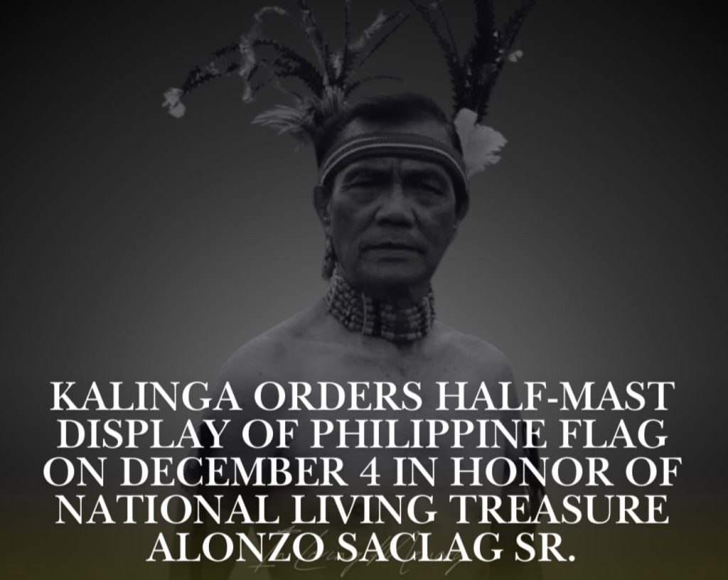 CARTABUK CITY, Kalinga , Philippines — Governor James S. Edduba has issued an Executive Order directing the half-mast display of the Philippine flag on all government buildings across the Province of Kalinga on December 4, 2025 to honor the late National Living Treasure (Gawad Manlilikha ng Bayan) Alonzo Ayutu Saclag Sr. The order recognizes the province’s deep mourning over the passing of Saclag, an esteemed cultural master whose lifelong dedication preserved and promoted Kalinga’s indigenous music, dance, rituals, and heritage. Widely respected as a cultural guardian, Saclag’s legacy has brought national and international recognition to the people of Kalinga. Edduba cited the Flag and Heraldic Code of the Philippines (RA 8491), which mandates the half-mast display of the Philippine flag as a sign of mourning on the day of interment of National Artists and National Living Treasures. “In honoring National Living Treasure Alonzo Saclag Sr., we honor the soul of Kalinga’s culture itself,” the order states. Under Section 1 of the Executive Order, all government buildings in the province are instructed to fly the national flag at half-mast from sunrise to sunset on December 4, 2025, the scheduled day of Saclag’s interment. Saclag Sr., 83, passed away on November 29, who was honored with the Gawad sa Manlilikha ng Bayan or National Living Treasures Award in 2000. He also founded the Kalinga Budong Dance Troupe in his bid to pass down his knowledge of the performing arts to the next generations. The Provincial Government of Kalinga calls on all offices, institutions, and communities to join in remembering and paying tribute to Saclag’s immense cultural legacy, which will continue to shape Kalinga’s identity for generations. (Province of Kalinga)