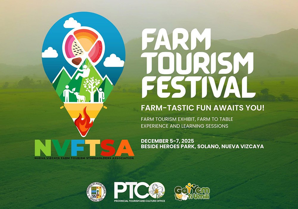 Region 2Showcases Province as ‘Heart of Farm Tourism in the North’ By Rachel Magday NUEVA VIZCAYA, Philippines – The provincial government of Nueva Vizcaya led by Gov Atty Jose V Gambito will hold the 2025 Agritourism Festival on December 5–7 at Solano Heroes Park in Solano, through the Provincial Tourism and Culture Office in partnership with the Nueva Vizcaya Farm Tourism Stakeholders Association (NVFTSA). Provincial Tourism Officer Marichelle O. Costales said the festival will showcase agritourism exhibits and learning sessions, fresh farm products and local delicacies, as well as creative booths featuring local entrepreneurs and their “Made in Vizcaya” products. Costales said the festival aims to go beyond a traditional celebration by promoting a deeper appreciation of agriculture and sustainable travel. “The festival is more than just a celebration; it’s a movement that connects people back to the land, honors the farmers and inspires sustainable tourism that nurtures both nature and the community,” she said. “Let us celebrate the beauty of our province and support the growing agritourism movement that makes Nueva Vizcaya truly the heart of farm tourism in the North,” Costales added. Gov. Gambito expressed full support for the activity, saying the festival affirms the province’s commitment to its farmers and countryside development. “This agritourism festival is our tribute to the hands that feed us and the land that sustains us. By opening our farms to visitors, we are creating new opportunities for our communities while showcasing Nueva Vizcaya as a premier destination for sustainable, farm-based tourism in Northern Luzon,” Gambito said.