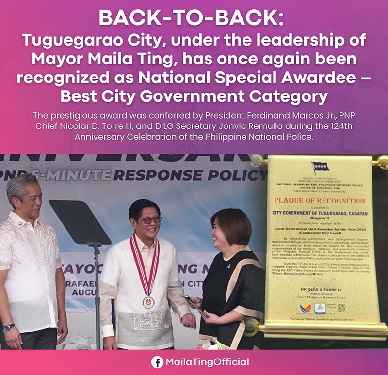 These recognitions underscore the commitment of Tuguegarao City and its law enforcement agencies to excellence in governance, public safety, and community service. (From Mayor Maila Ting)
