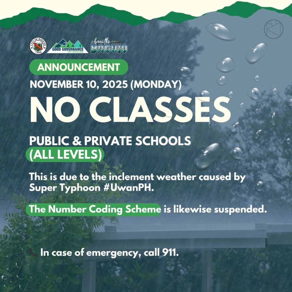BAGUIO CITY – Mayor Benjamin Magalong declared the suspension of classes in all levels, both public and private, on November 10, which is expected to bring heavy rains and winds as typhoon ‘Uwan’ passes through Baguio City on Sunday.