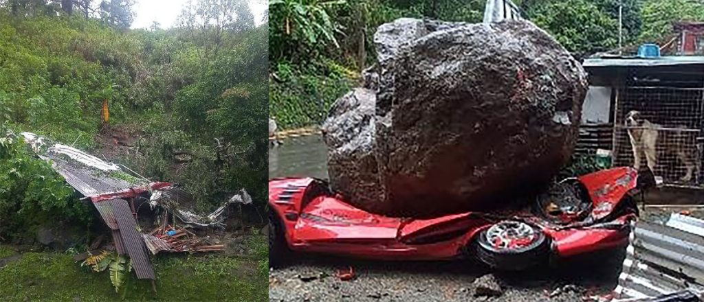 Bahay,kotse wasak sa paggulong ng bato mula sa bundok