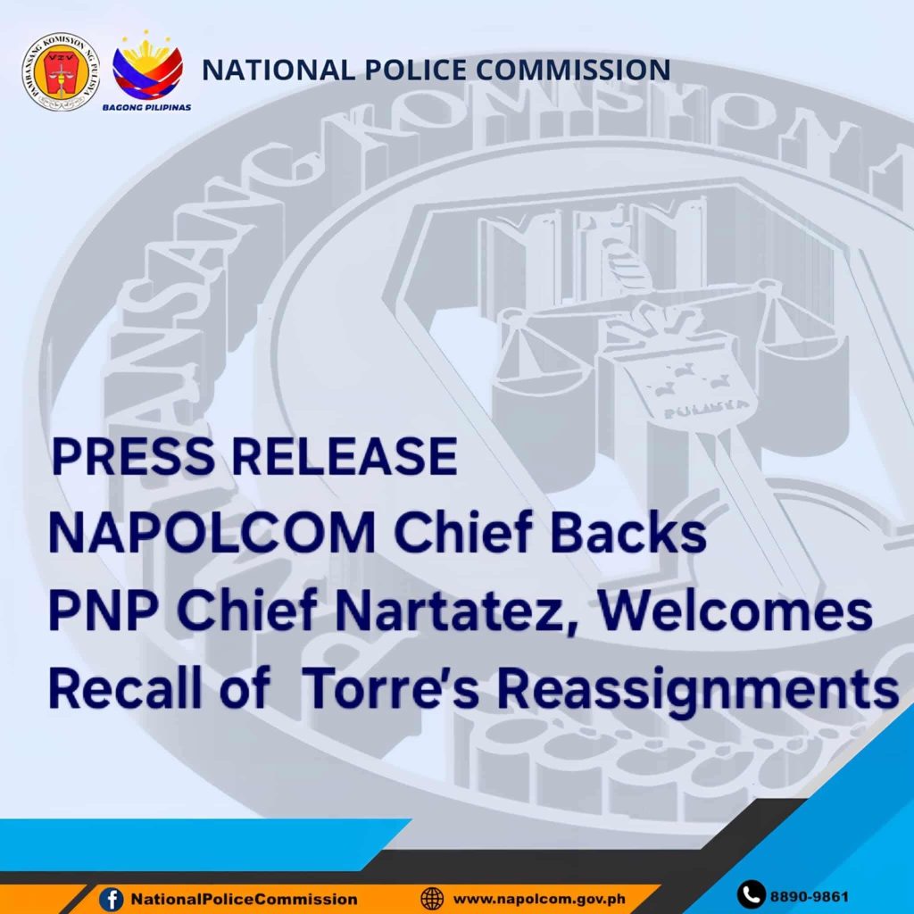 NAPOLCOM Chief Backs PNP Chief Nartatez, Welcomes Recall of Torre’s Reassignments