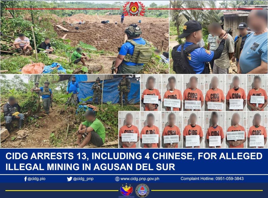 The CIDG Regional Field Unit 13, together with the Enforcement Division, Department of Environment and National Resources Region 13, the PNP Special Action Force, and territorial police units, launched a law enforcement operation under CIDG OPLAN KALIKASAN (Campaign against Unlawful Destruction of Natural Resources) in Barangay Bunawan Brooks, Agusan Del Sur, that resulted in the arrest of thirteen suspects, including four Chinese on July 10, 2025.