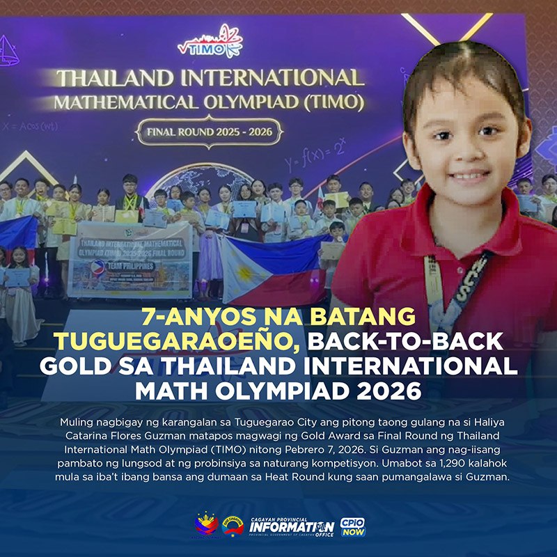 TUGUEGARAO CITY, Philippines — Muling nagbigay ng karangalan sa Tuguegarao City, Cagayan, ang pitong taong gulang na si Haliya Catarina Flores Guzman matapos magwagi ng Gold Award sa Final Round ng Thailand International Math Olympiad (TIMO) nitong Pebrero 7, 2026.