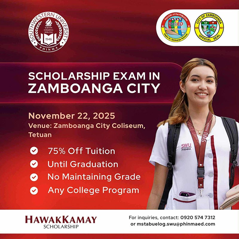 To grab the opportunity, a scholarship examination is set on Saturday, November 22 from 9 am to 4 pm at Mayor Vitaliano D. Agan Coliseum in Tetuan, where all incoming first-year college students for SY 2026–2027 may take the exam for free.