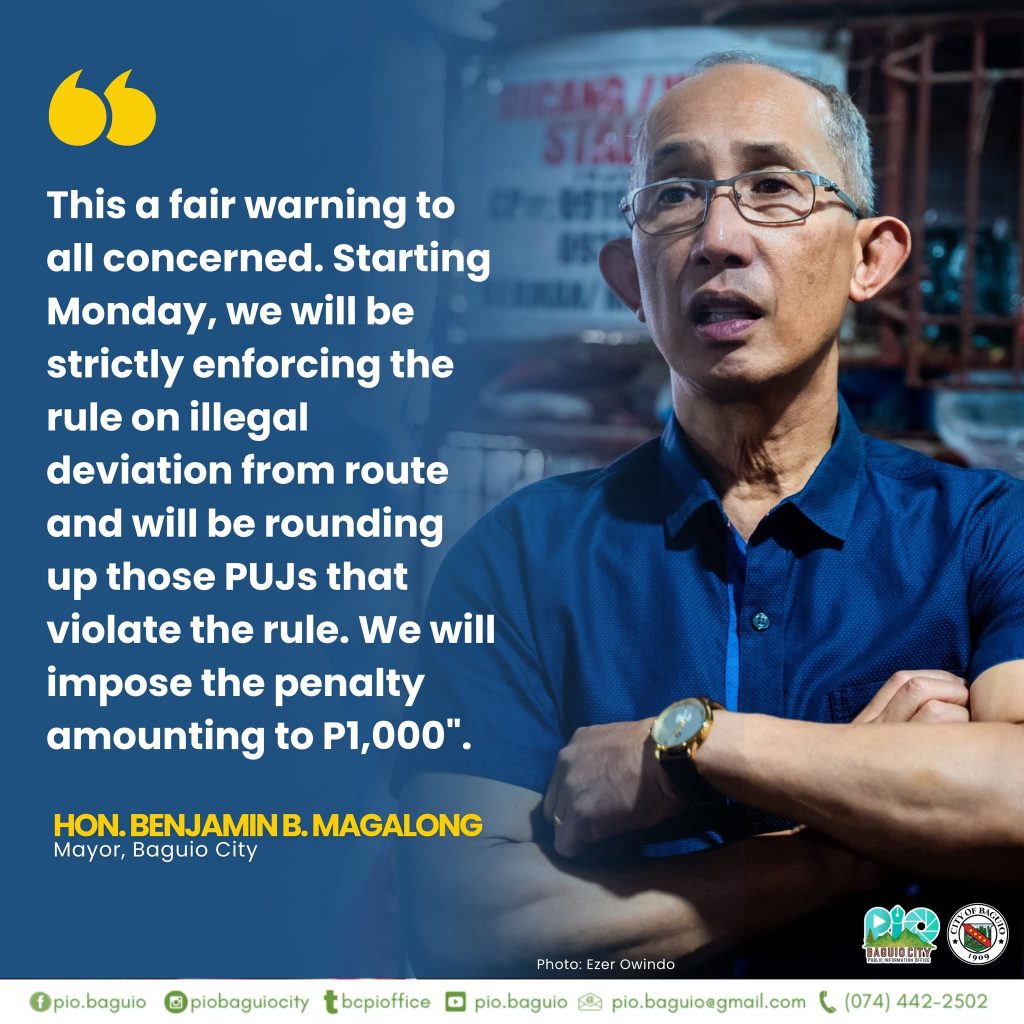 BAGUIO CITY — Mayor Benjamin Magalong warned public utility jeepney (PUJ) drivers plying the La Trinidad route who cut trip or deviate from their designated route of sanctions if they continue with their illegal practice that deprives commuters of the much needed transport service.