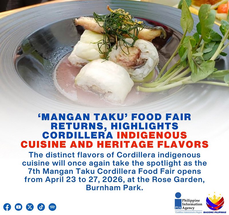 BAGUIO CITY (PIA) – The distinct flavors of Cordillera indigenous cuisine will once again take the spotlight as the 7th Mangan Taku Cordillera Food Fair opens from April 23 to 27, 2026, at the Rose Garden, Burnham Park.