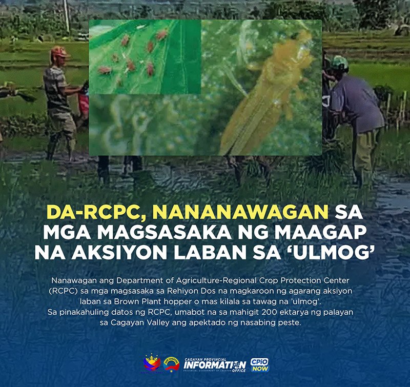 CAGAYAN, Philippines — Nanawagan ang Department of Agriculture-Regional Crop Protection Center (RCPC) sa mga magsasaka sa Rehiyon Dos na magkaroon ng agarang aksiyon laban sa Brown Plant hopper o mas kilala sa tawag na ’ulmog’.