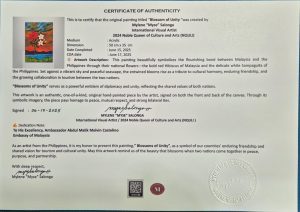 2024 Noble Queen of Culrure and Arts International Visual Artist Myse Salonga honored to present her artwork titled “Blossoms of Unity” to H.E. Malaysian Ambassador Abdul Malik Melvin Castelino, on June 17 2025.